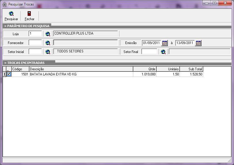 Nessa tela o usuário irá Pesquisar e selecionar as trocas que são baixadas e emitidas na nota Fiscal.